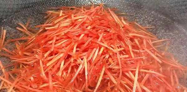 将一根胡萝卜磨成细条,锅中水烧开,加入胡萝卜条,用水焯30秒,捞出晾凉,沥干水分待用。