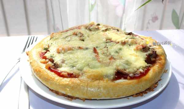 鲜虾披萨做法:原料:面粉、酵母粉、番茄酱、黑胡椒、洋葱、香菇、火腿、青椒片、鲜虾、橄榄油。