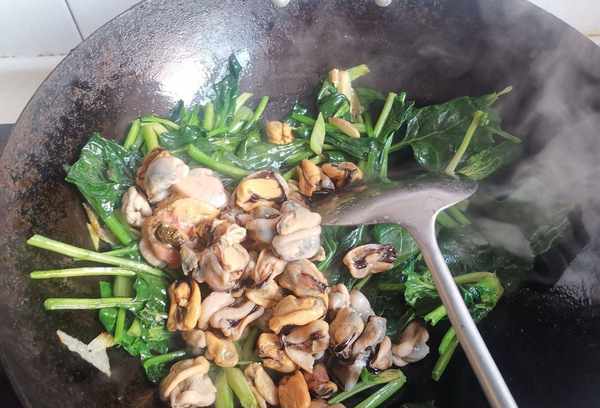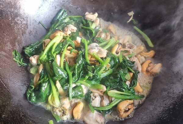 第三步:炒好的菠菜半熟,倒入海虹肉继续炒匀。