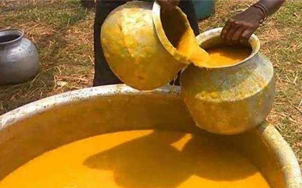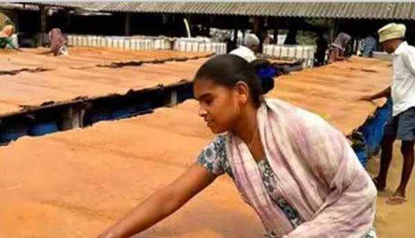 之后,将芒果果肉切碎,放入芒果研磨机中制成芒果果肉。在所有的芒果都被打成浆后,他们开始将芒果浆摊开晾干。我们可以看到,芒果干的制作实际上是手工完成的,没有任何防护措施,让人觉得很卫生。