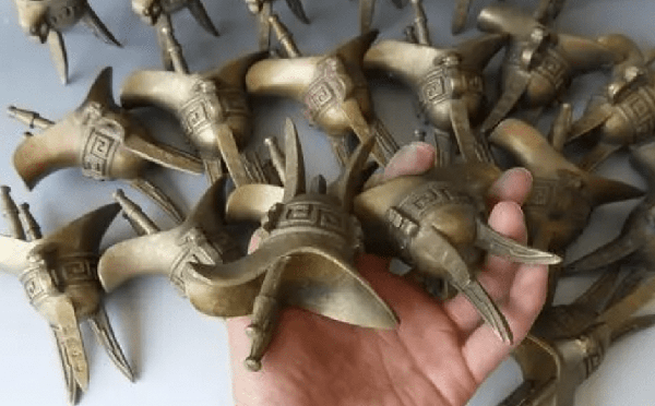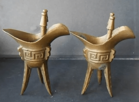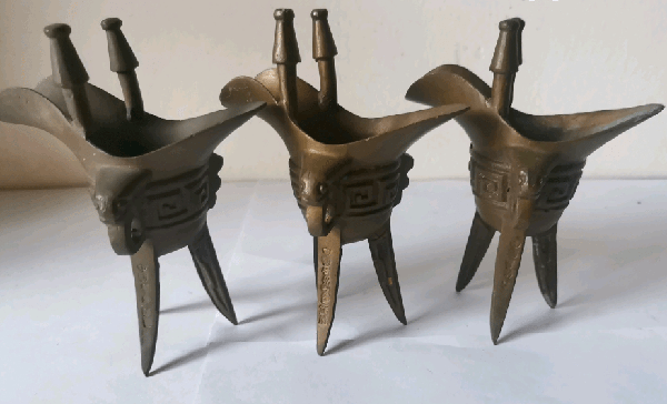 别看它只是个简单的铜樽,但其结构很有特色,身上宽的两边叫“流”,窄的地方称作“尾”,滤网可以挂在中间的两根柱子上,可以将杂质比较多的白酒过滤掉。