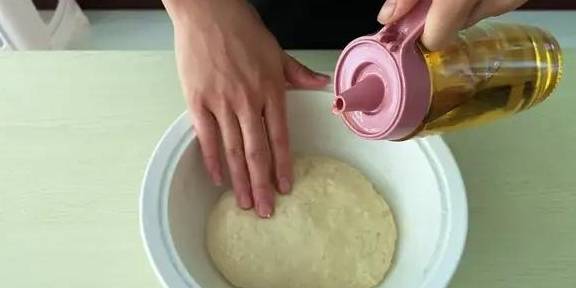 步骤三、再放入食用油(不要用豆油,清油最佳),将油揉进面团中(经过这一步揉出来的面团会非常的光滑,而且揉起来会非常滋润)