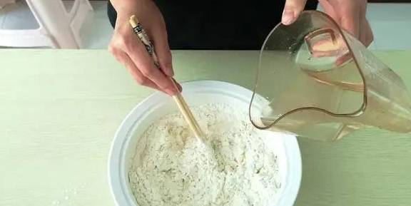 步骤二、倒入清水搅成小面絮,然后揉成光滑的面团(面粉吸水性不一样,放入清水要分次放入,这样能把控好水量,用凉水温水都可以,温水稍微发酵快一些),揉好的面团非常柔软,但是绝不是稀得沾手的那种