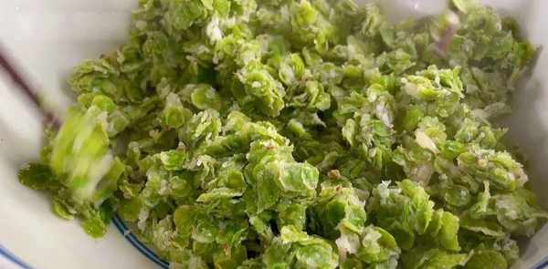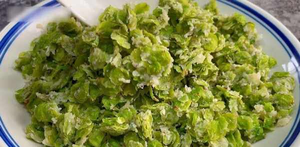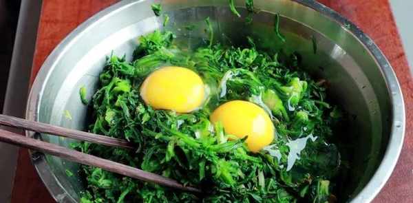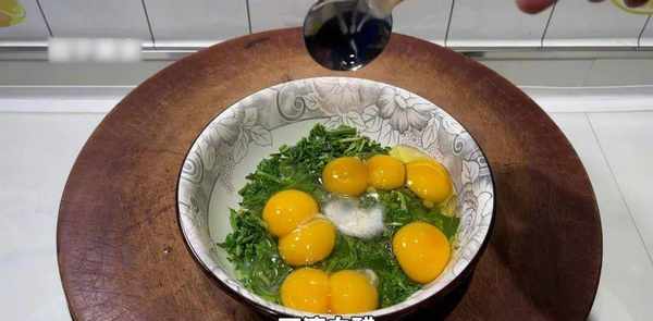 挤干水分,切碗,打四个鸡蛋。加入一茶匙盐和少许胡椒粉以去除鱼腥味并增加风味。两滴白醋也可以去腥,压碎