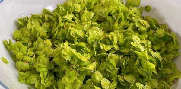 将洗净的榆钱放入大碗中。榆钱要放少许水,鱼钱不用晒干,再加入少许食用油,将油和鱼钱拌匀。