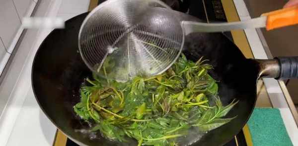 当水沸腾时,在锅中加入一勺碱性糊状物。然后将荠菜放入开水锅中煮开。加入少许糊状物,可使菜色保持翠绿不变色。煮大约十秒钟。把它全部从水里拿出来放在冷水里