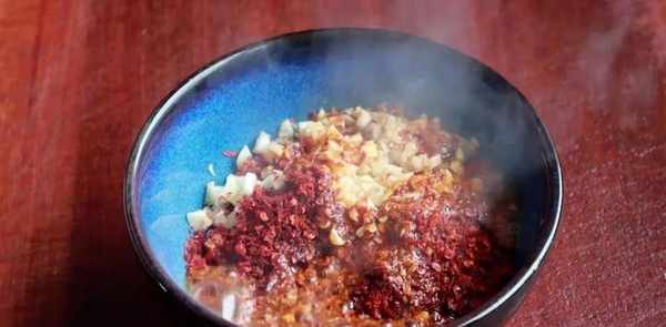 做酱汁,将蒜末、小米椒和蒜末放入碗中。加入两汤匙辣椒粉。然后拌入辣椒油。然后加一勺盐,加生抽,加少许醋,用勺子搅拌。