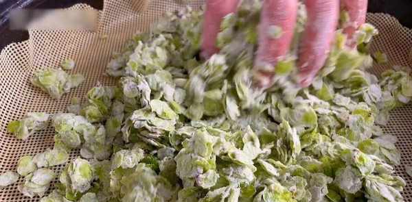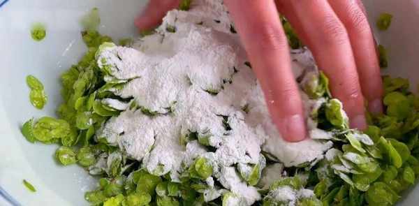 然后取出不粘龙垫,倒入拌有面粉的榆钱。它是手动释放的