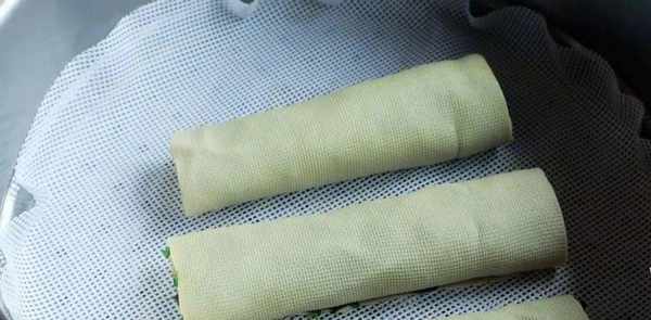 就这样,把豆腐皮对折起来。卷好后,将其切成两半,放入铺有篮布的烤盘中。锅里的水烧开后,直接用大火加热八分钟