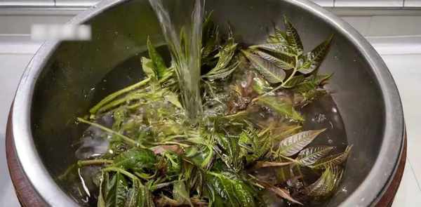 将香椿放入盆中,加入一茶匙盐,加水,若没过水,则浸泡十分钟。