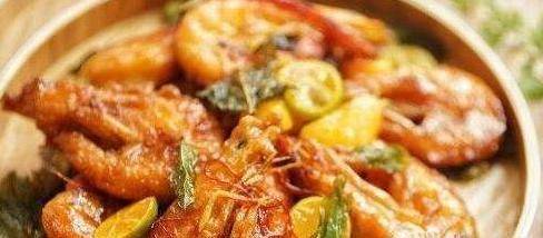4.加入糖醋汁加热1分钟至浓稠。将炸好的大虾放回锅里快速煎至表面和酱汁差不多,然后加入一片柠檬和半个小青橙片,煎两遍后出锅。
