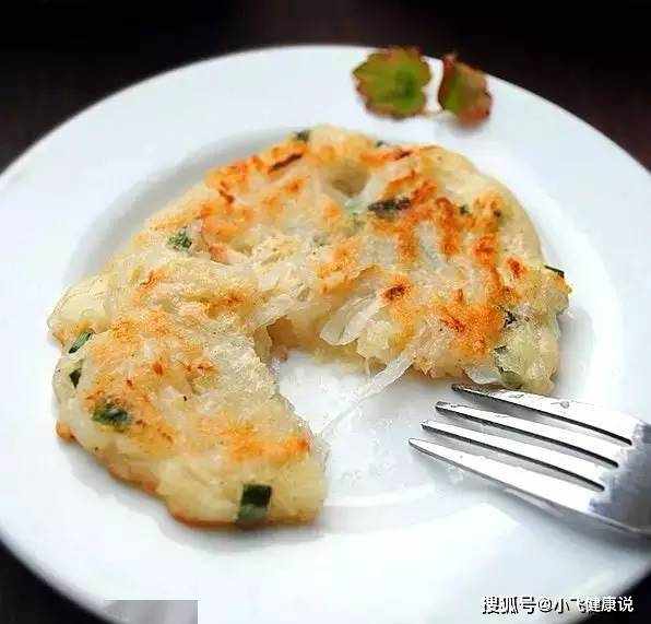 3、平底锅烧热少许油,往锅里倒入一茶匙玉米粉,用勺子撒上,把拌好的萝卜和葱花铺在锅上,再倒入粘米粉。洋葱馅,翻炒至两面金黄