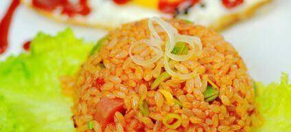 7、最后将米饭倒入锅中,炒匀后关火离锅。