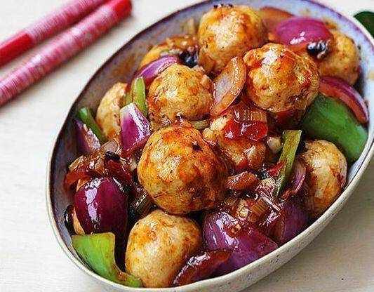 原料:鸡丸250克、辣椒1个、洋葱1个;郫县豆瓣酱1汤匙、糖2汤匙、葱1份、豆豉3瓣、生抽1茶匙;
