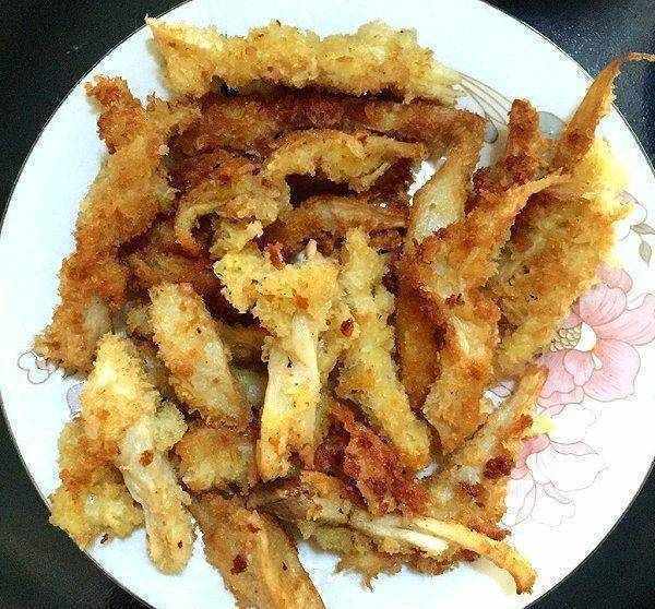 材料:杏鲍菇、鸡蛋、面粉、面包屑、盐、黑胡椒
