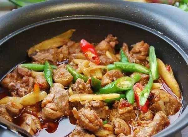 材料:鸭半只、鲜姜3片、青红椒各适量、辣椒适量、蒜片适量、郫县豆瓣1.5汤匙、料酒3汤匙、酱油1汤匙酱汁,5汤匙。冰糖粒和盐适量。