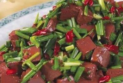 锅中油烧热,油热后倒入切好的葱姜爆香,倒入猪血翻炒片刻,倒入料酒、韭菜和盐.炒匀,关火,起锅装盘。咸鸭肫