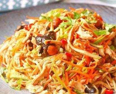 将鸡胸肉放在案板上,用擀面杖松开,用手撕成条状。将韭菜洗净,切成方块备用。将辣椒油、芝麻酱、香醋、酱油、胡椒粉、香油和糖放入碗中拌匀。倒在磨碎的鸡肉上,加入切好的洋葱,拌匀。倒入盘中即可食用。