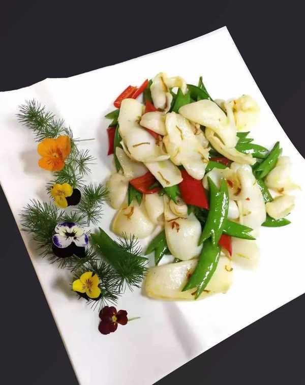 实践:1.将甜豆两端的四季豆去掉,用刀备用;将墨鱼片切成薄片,用冰水浸泡15分钟后捞出,加入少许鸡肉、糖、淀粉备用。