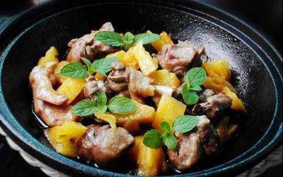 材料:鸭肉400克,菠萝半个,大葱2个,姜5片,蚝油1汤匙,生抽1.5汤匙,料酒2汤匙,糖少许,油少许。