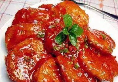 5、锅中放入白糖和白醋,加入番茄酱,用淀粉水勾芡后浇在藕上。