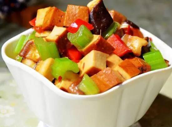 配料:豆腐干、香菇、青椒、蒜末、牛肉酱、酱油、糖、盐、鸡粉、油。
