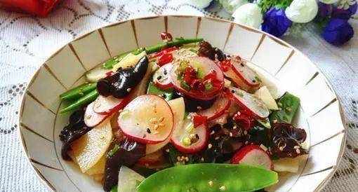 材料:配料:土豆40克,豌豆25克,黑木耳8朵,樱桃萝卜5块。