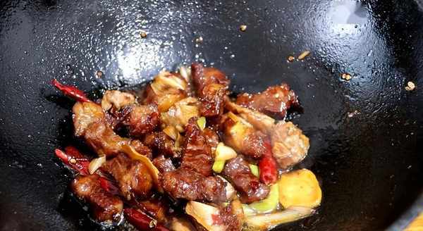 4、空锅中加油,放入四五块冰糖,小火炒至变色,变成焦褐色时,倒入牛腩翻炒,炒至牛腩变色。