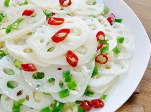 做法:1、大葱切段;小米椒切成小圆片;藕片去皮洗净,切成薄片,漂洗两遍,去除多余的油脂,藕片稍凉;