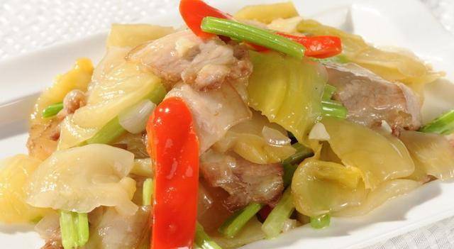 1、五花肉用盐、醋、面粉洗净,再煮2分钟,用刀刮去粘液,切条。