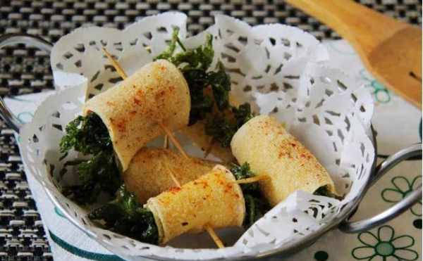 2、香菜洗净,比豆腐干的宽度稍微长一点,卷进去;
