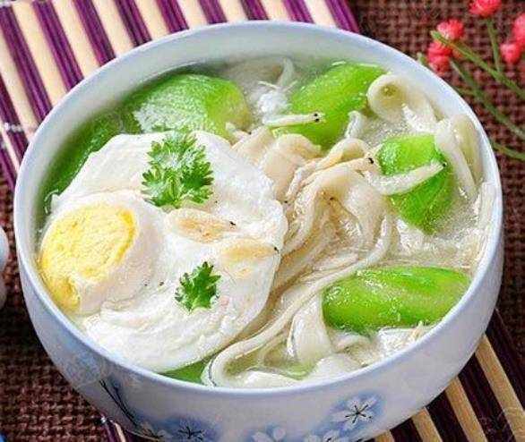 原料:丝瓜1条、鲜面250克、鸡蛋2个、虾皮、葱姜蒜15克、盐1茶匙、胡椒粉1/4茶匙