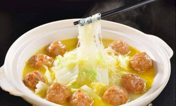 4、倒入丸子和红薯粉条,加水至材料的2/3,大火烧开转小火炖;