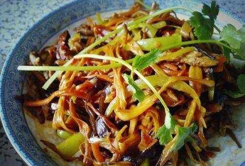 原料:葵花干50克,胡萝卜1根,干香菇30克,灯笼椒1个,肉300克,豆瓣酱1勺,八角1个,姜末1勺,蒜末1勺,蒜末1勺糖,1勺醋