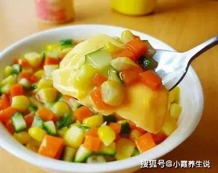 3.热锅下玉米粒、青豆粒和胡萝卜丁翻炒,收干后加少许水淋上香油,蒸好的蛋羹加半勺酱油,下入切好的菜丁上面烤和服务罐头。