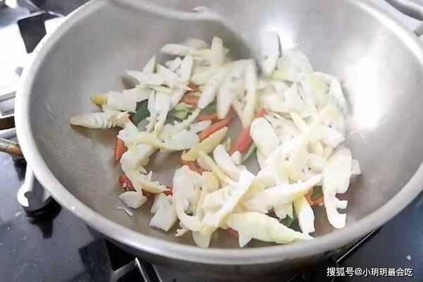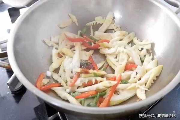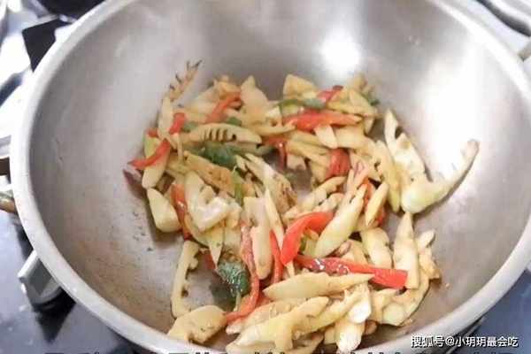 第四步:我们再将焯好水的春笋放入锅中翻炒。