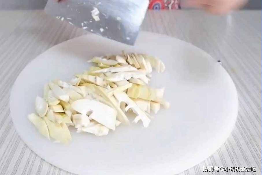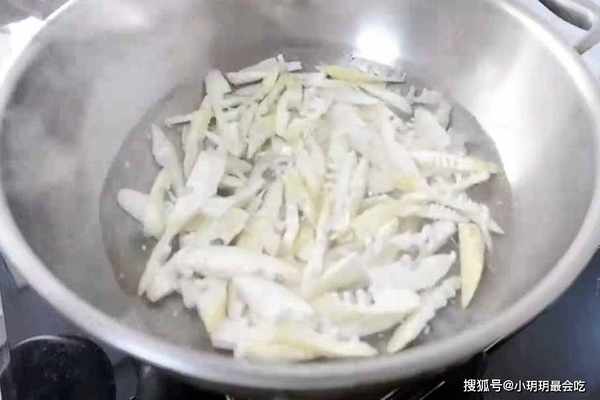 3、在这道菜时,一定要将春笋焯水,因为笋的苦涩味比较重,焯水不仅可以将其味,放点植物油还可以起到提鲜的作用。