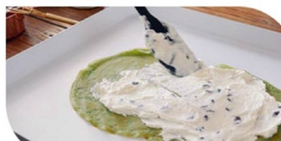 涂上一层淡奶油,还有这边,淡奶油的话不能涂到可丽饼的尾部。