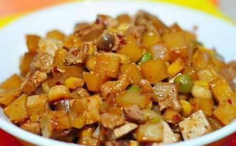 配料:猪里脊肉、香干丁、笋丁、香菇丁、芹菜丁、花生仁、熟牛肚丁、毛豆仁、鸡蛋、葱花、姜末、水淀粉、植物油、辣椒酱、料酒、白糖,咸