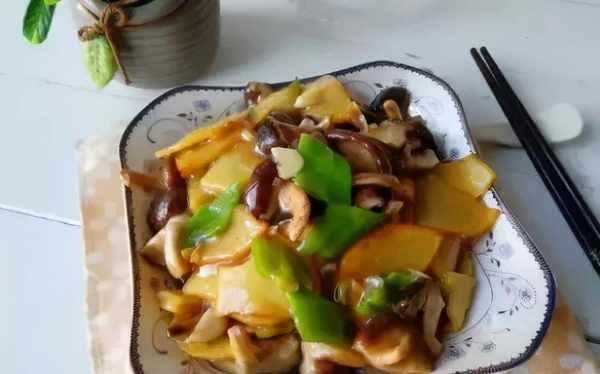 材料:土豆2个、香菇250克、辣椒2个、油盐适量、葱1片、姜2片、蒜2瓣、酱油1汤匙、淀粉1/2汤匙,1茶匙糖