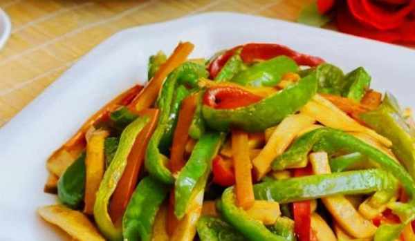 1、将腌制好的里脊用水浸泡1小时,上笼蒸熟,晾凉后切成薄片。将青椒洗净,用斜刀切成片。油锅烧热至40%热,放入豆腐炒至表皮变硬,捞出,放凉切条。