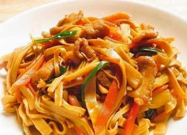 4:将肉丝放回锅中用千张炒一下,淋上一勺酱油炒匀。