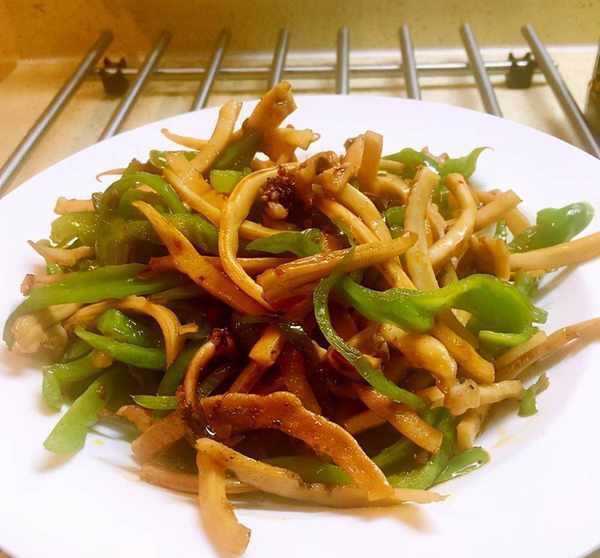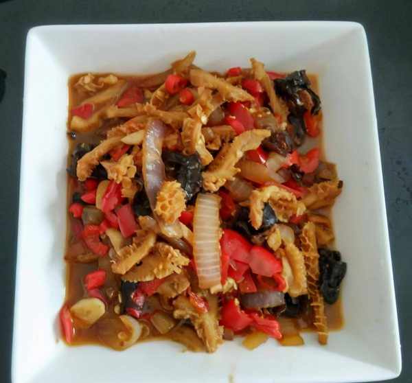 配料:牛肚200克,黄、红辣椒各半,花椒少许,香菇少许,大蒜各半,干辣椒少许,盐、糖、酱油;