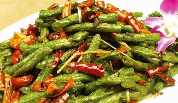 原料:四季豆400克,猪肉碎150克,干辣椒6条,姜1小块,蒜1头,生抽,盐,白糖少许,老抽。