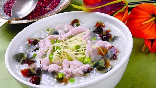 4、水烧开,加入米饭烧开,转小火,加入皮蛋、瘦肉丝、盐、鸡精、葱花,煮约50分钟,即可加入剩下的腌制鸡蛋块和葱花,用小火煮10分钟。