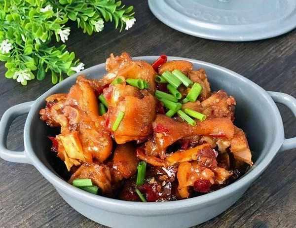 材料:猪蹄1只,蒜头2瓣,红辣椒2个,生抽1/2茶匙,白糖1/2茶匙,葱姜各少许,料酒少许。