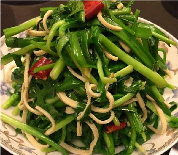 原料:韭菜300克,叶子2千片,红辣椒1个,盐适量;