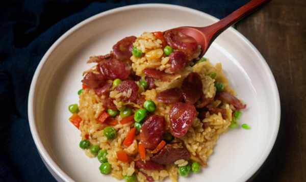材料:米饭、香肠、三块(豌豆、胡萝卜片、玉米粒)、葱姜末、盐、生抽