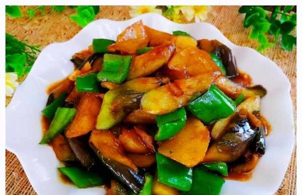 4.取土豆、茄子和青椒。哇,写不下去了,就写到这里吧。加入老抽、盐和两块冰糖。翻炒2分钟,加水,一勺酱油,盖上锅盖,炒5分钟。最后水淀粉勾芡后放入锅中