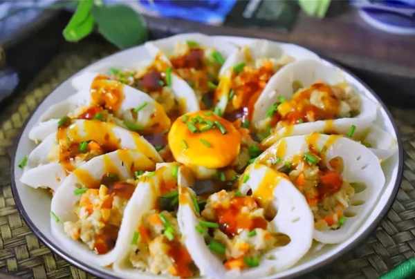 6、取一块放凉的藕,上面放上肉馅,装盘,中间放一个蛋黄。